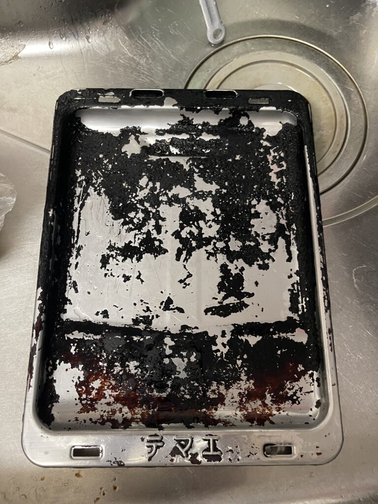 これはもう焦げがやばいくらいで、新品の時は綺麗なシルバーだったんですけど、焦げがひどく、もう手に負えないくらいです。